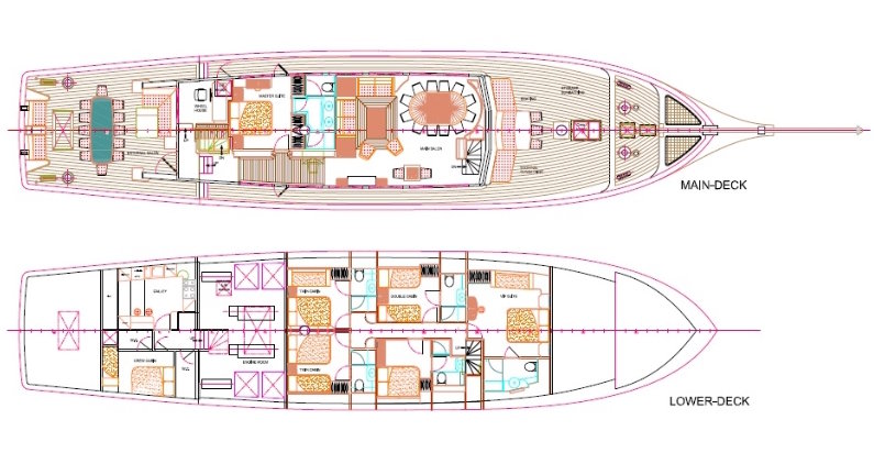 - 6 cabins : 1 master cabin with queen bed, 1 VIP cabin with queen bed and sofa, 2 cabins with one double bed and one large size single
