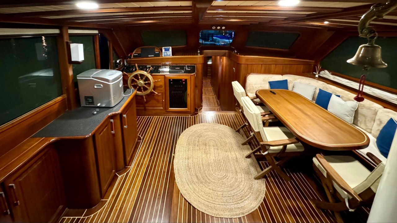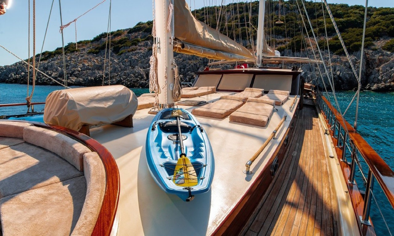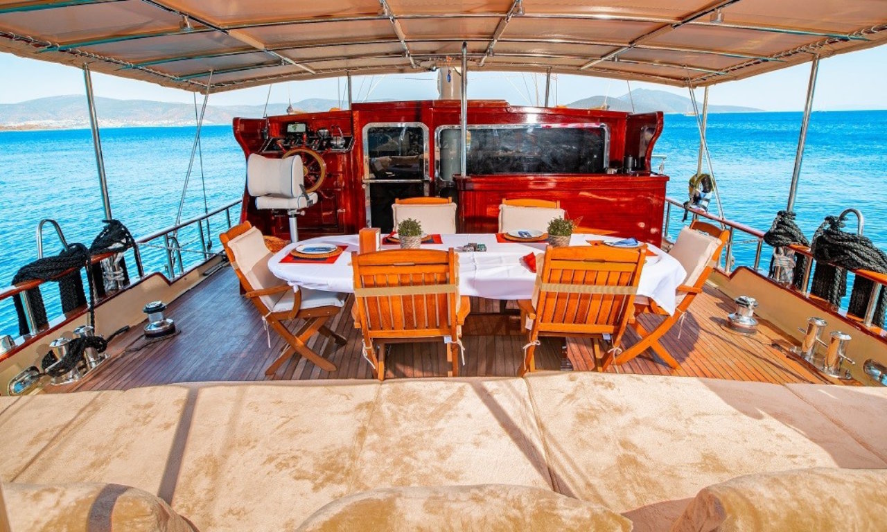 sunbathing cushions are available on foredeck. For dining, there are tables at the aft and inside the saloon.